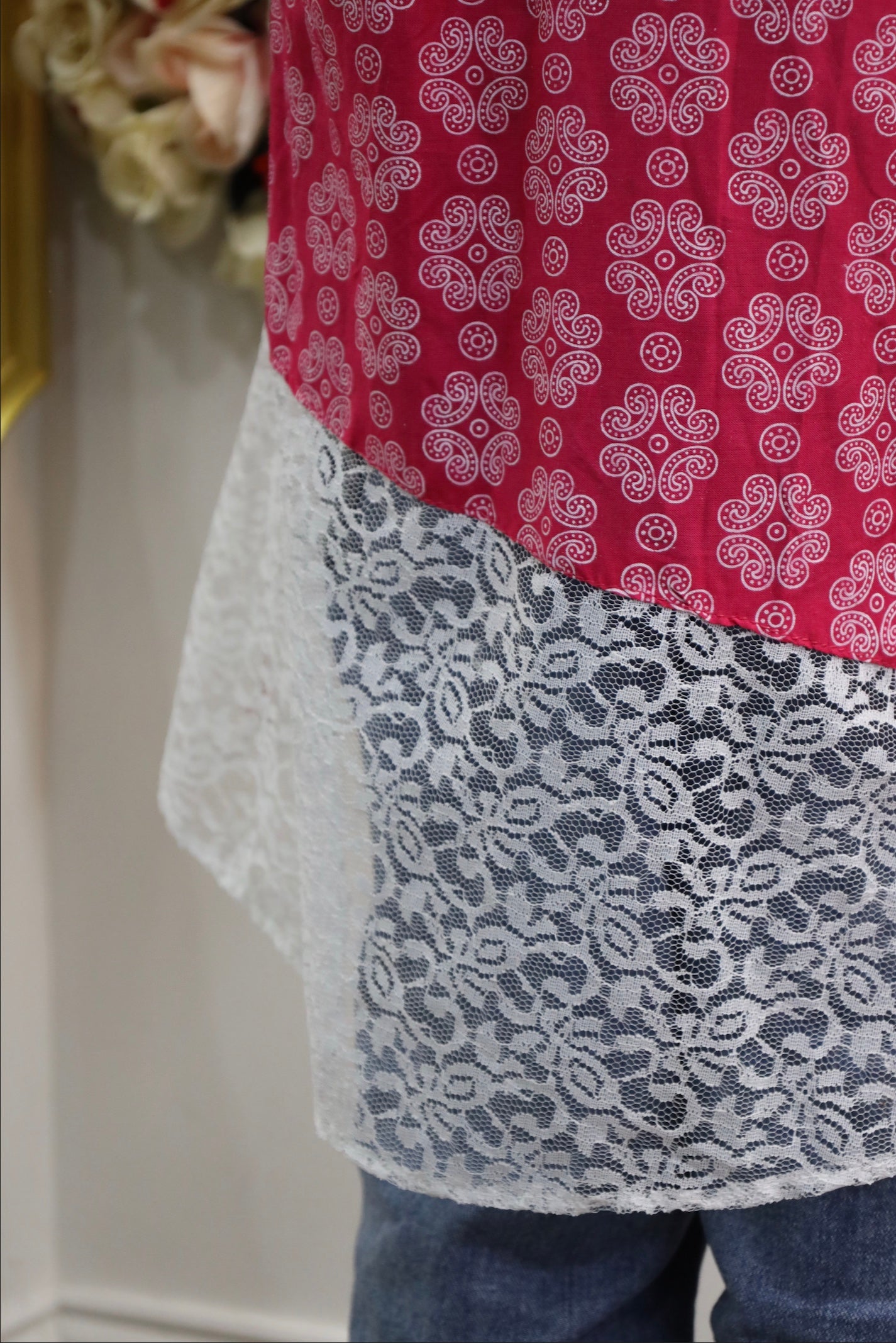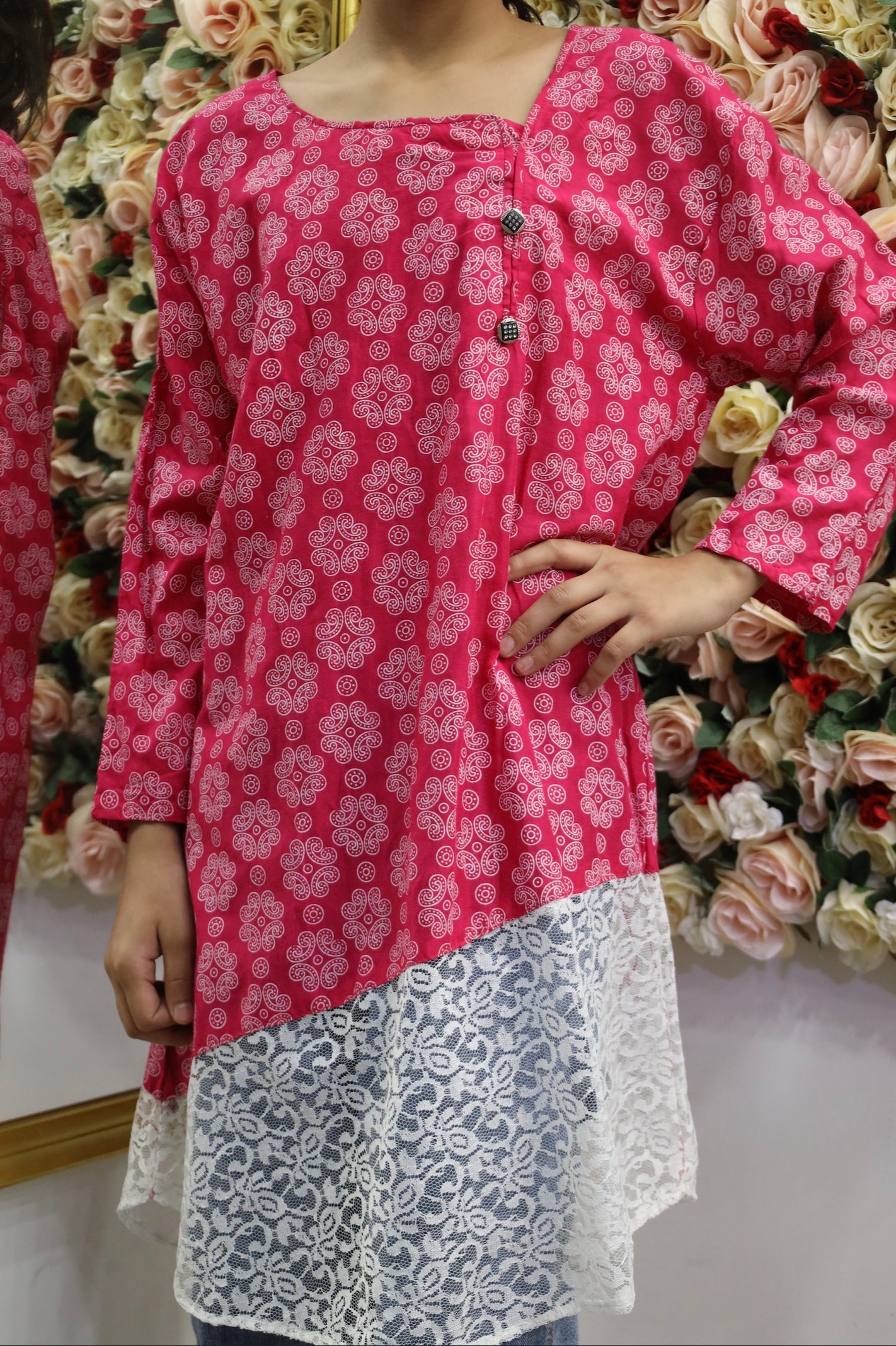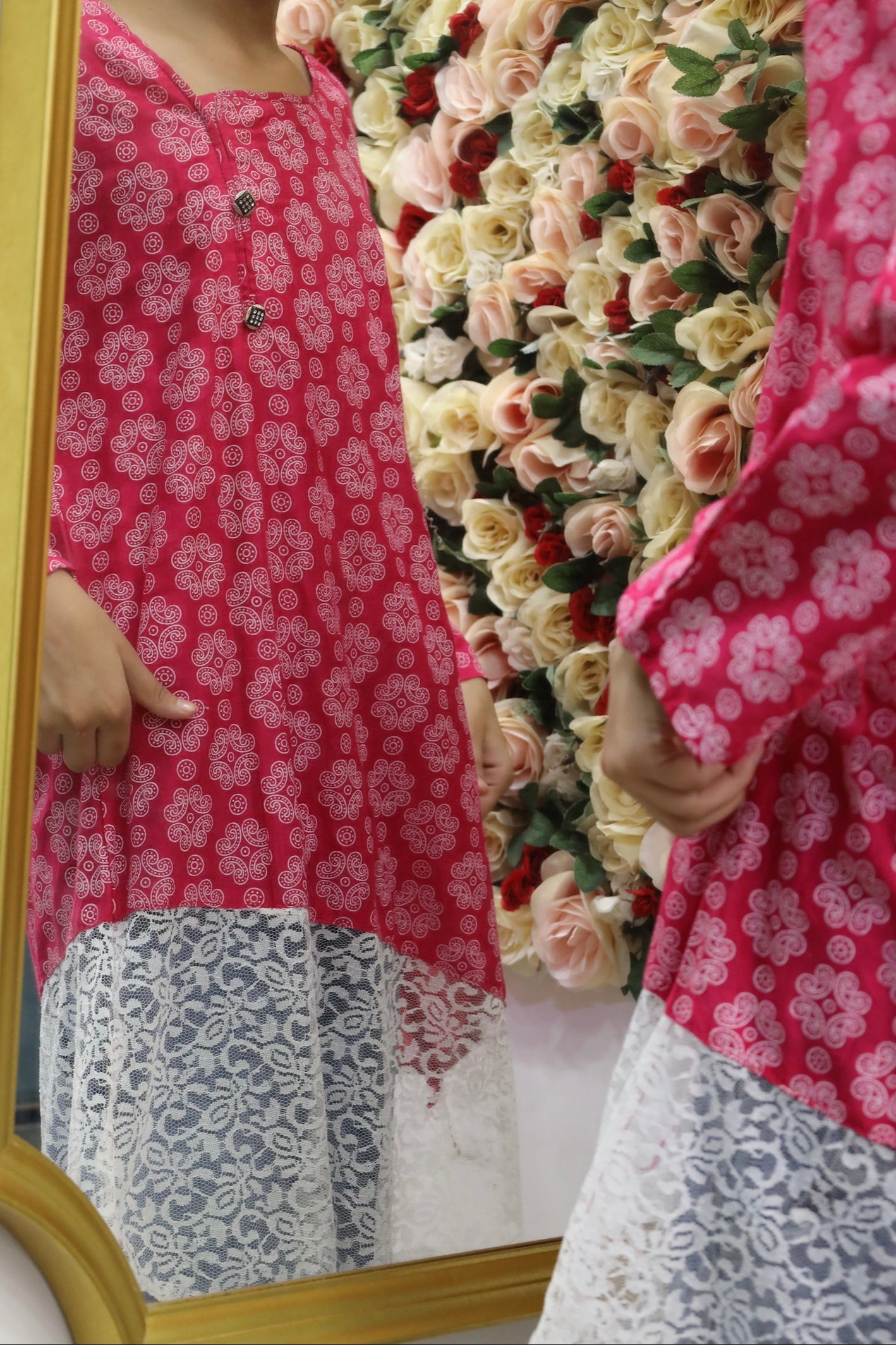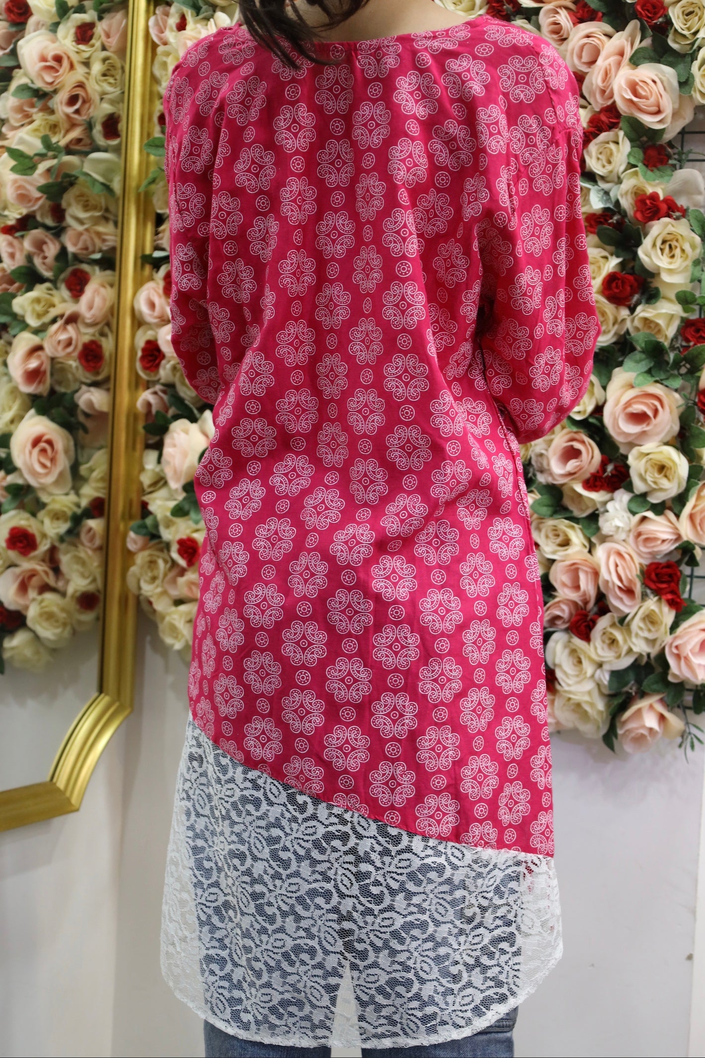 Chic Pink Printed Kurti with White Lace Hem Brighten up your wardrobe with this stylish pink kurti, featuring a playful...