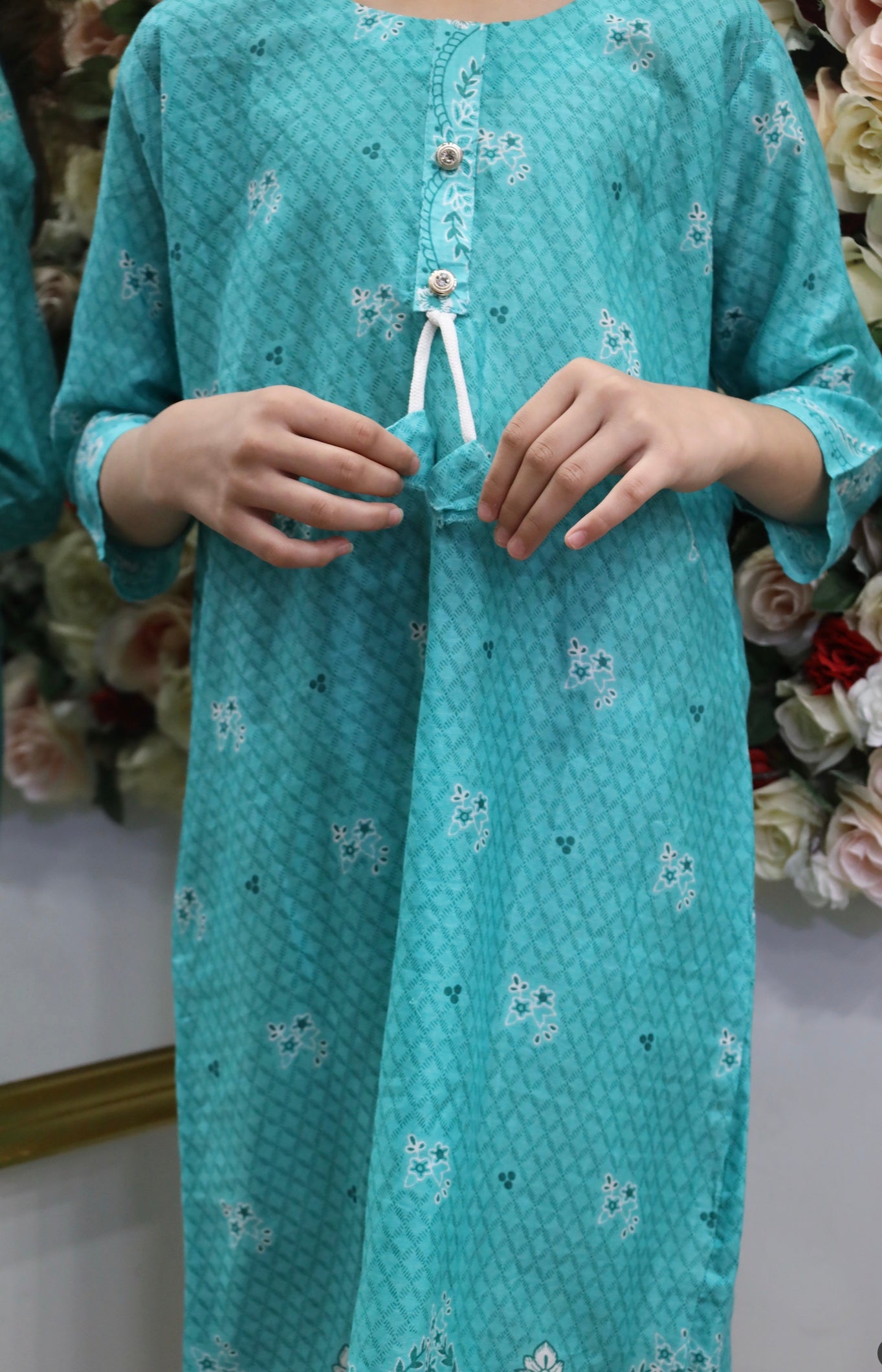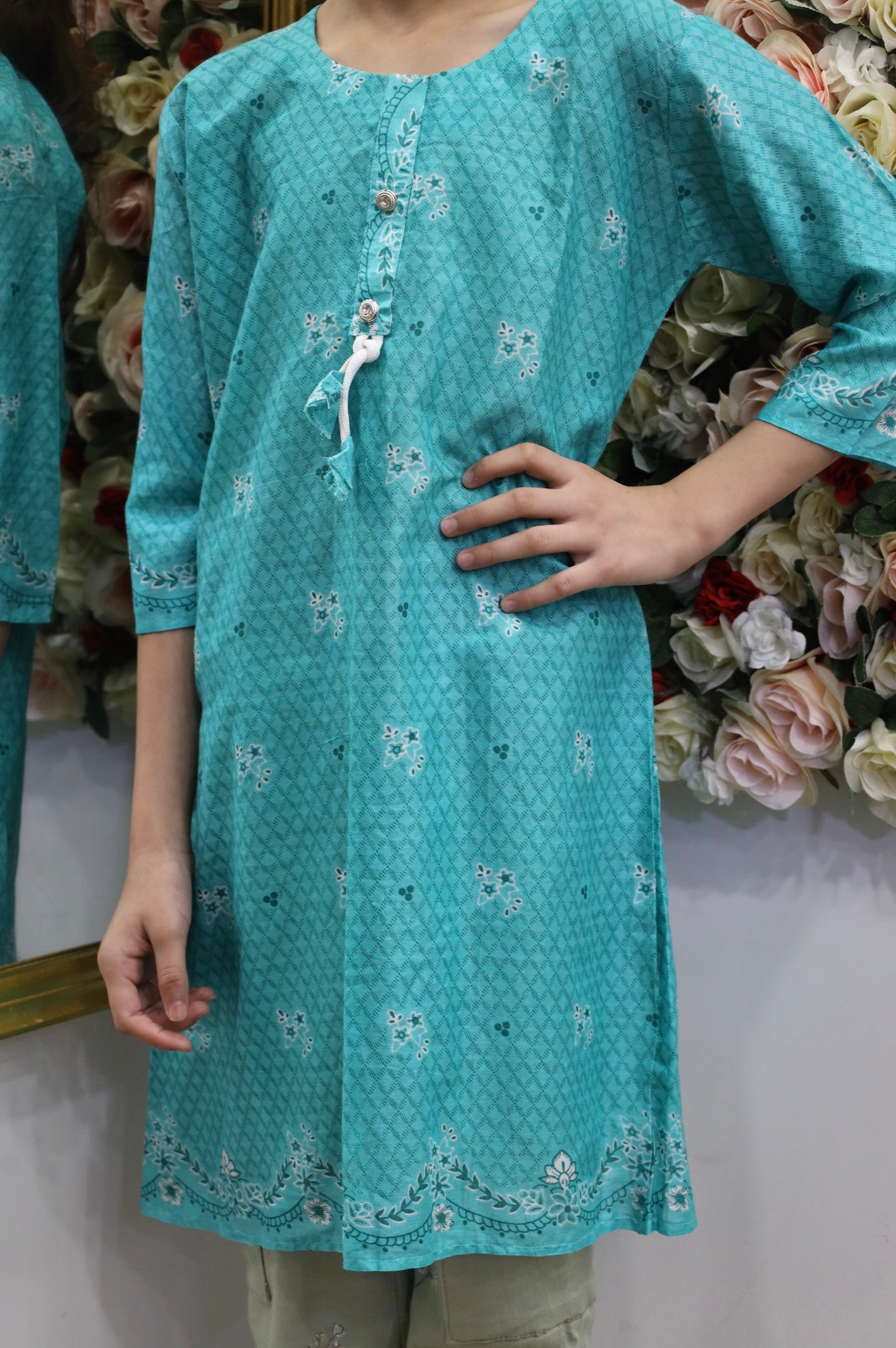 Add a splash of charm to your little one's wardrobe with this beautiful aqua blue 1-piece kurti. Made from soft, breathable fabric, this kurti features a delicate all-over print with subtle floral motifs and a decorative border at the hem. The design is completed with a round neckline, button detailing on the front placket, and cute fabric tassels for an added touch of style. With its 3/4 sleeves and comfortable fit, it’s perfect for casual outings, family gatherings, or everyday wear.