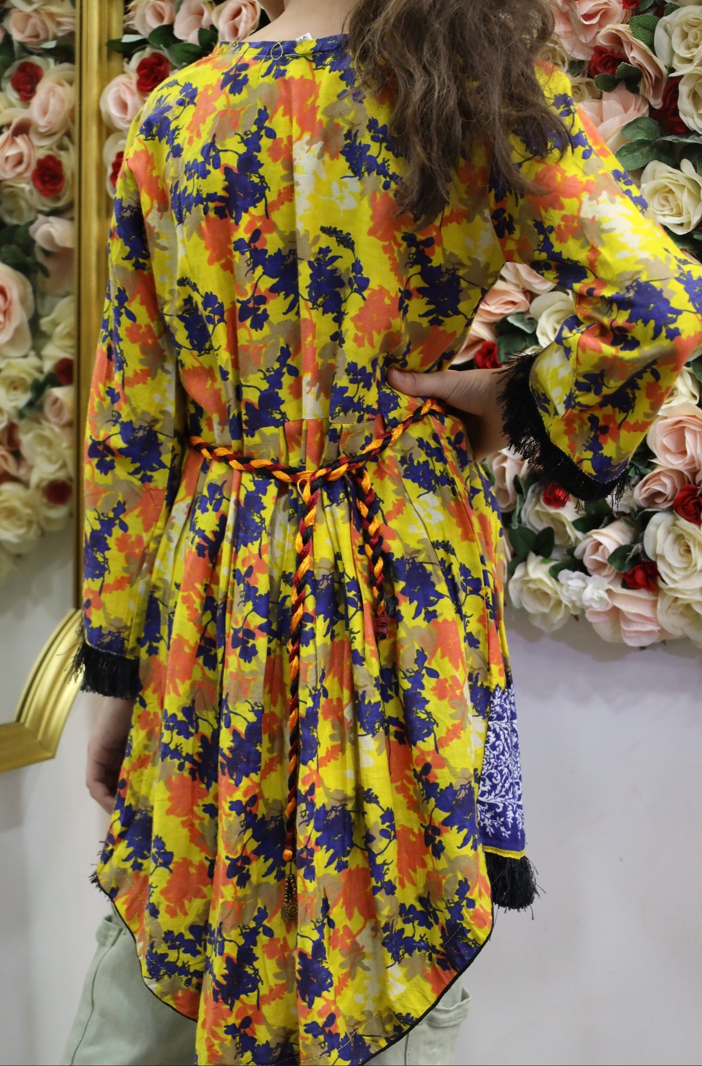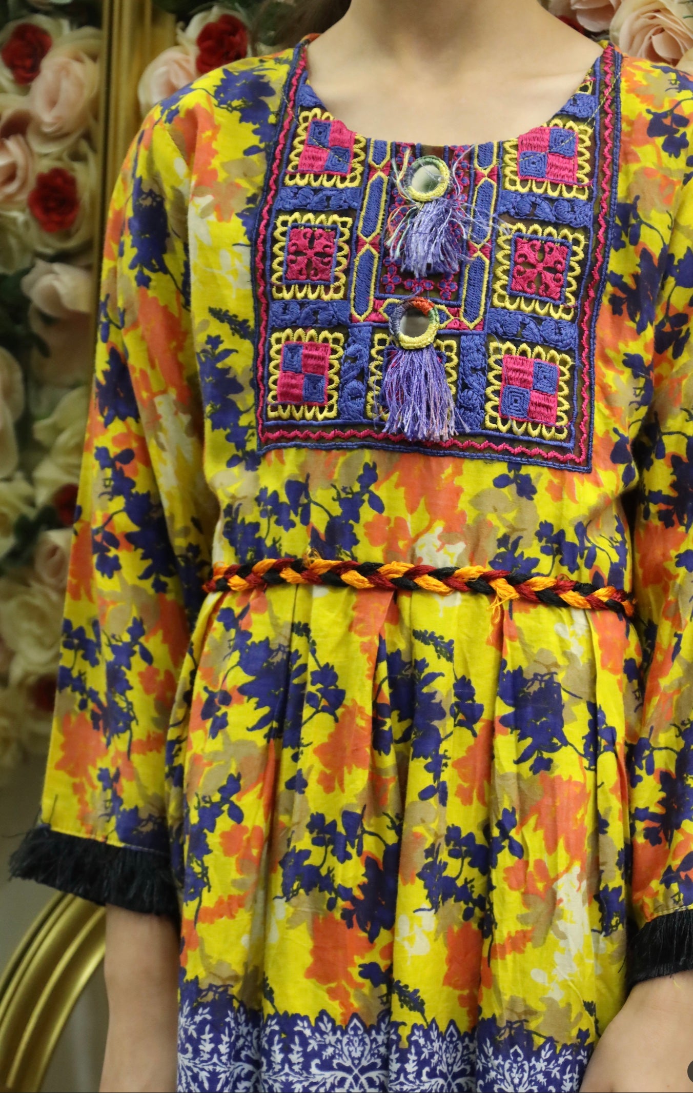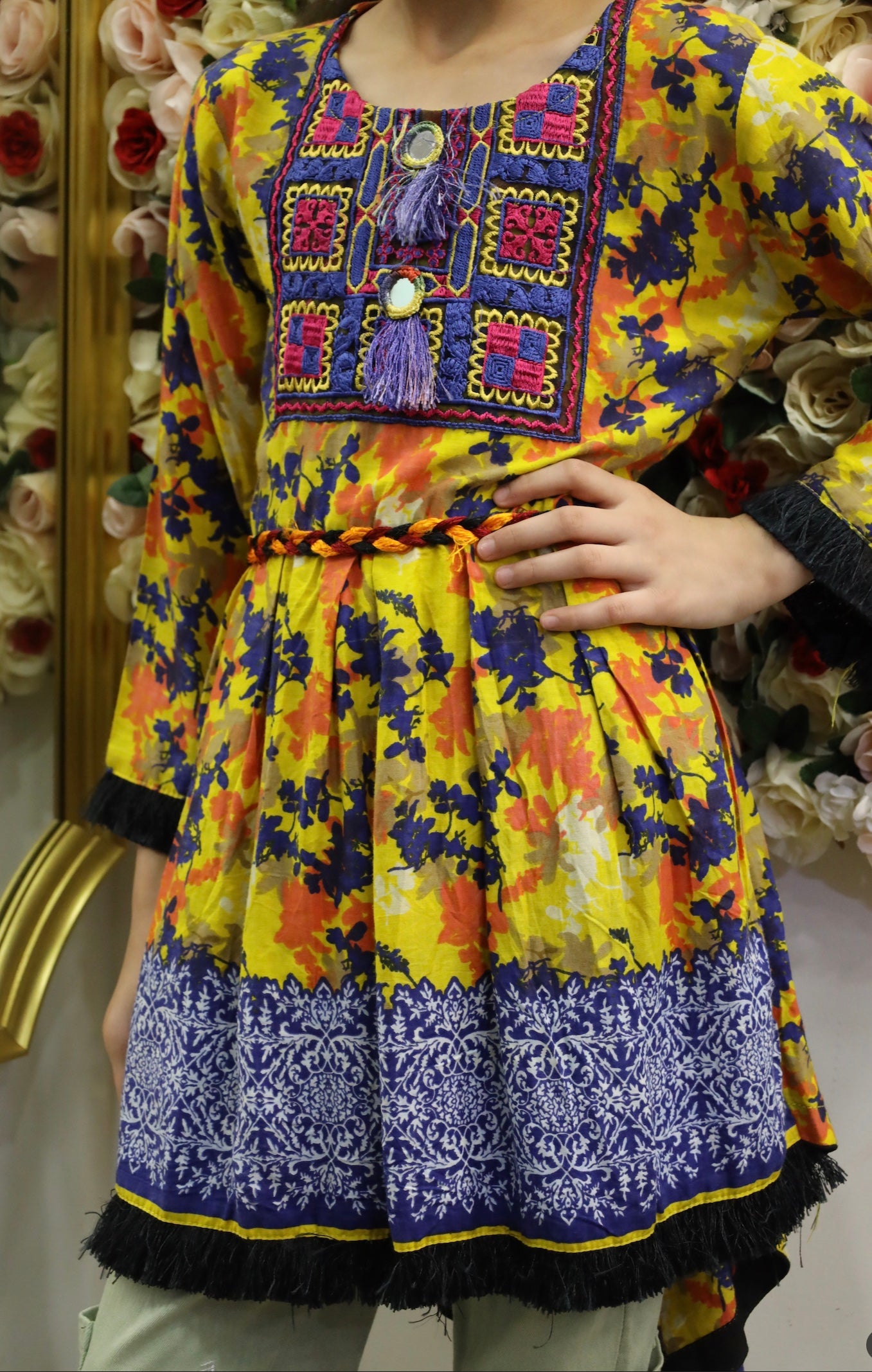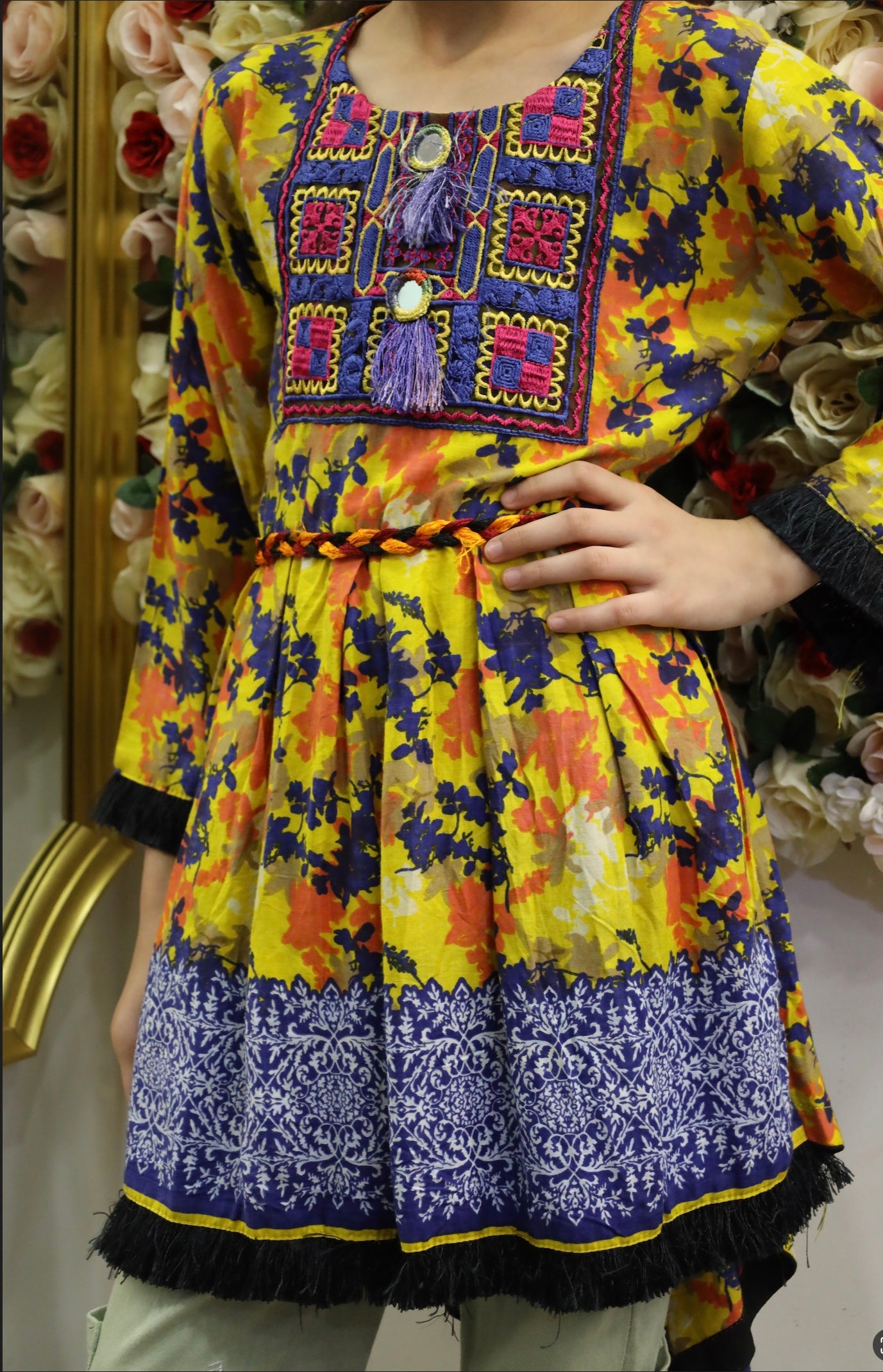 Let your little one shine in this eye-catching multicolor embroidered lawn frock, designed with playful details and a bold color palette. Featuring traditional embroidery with mirror work and tassels, this outfit blends ethnic charm with modern flair – perfect for festive occasions and stylish day-outs.