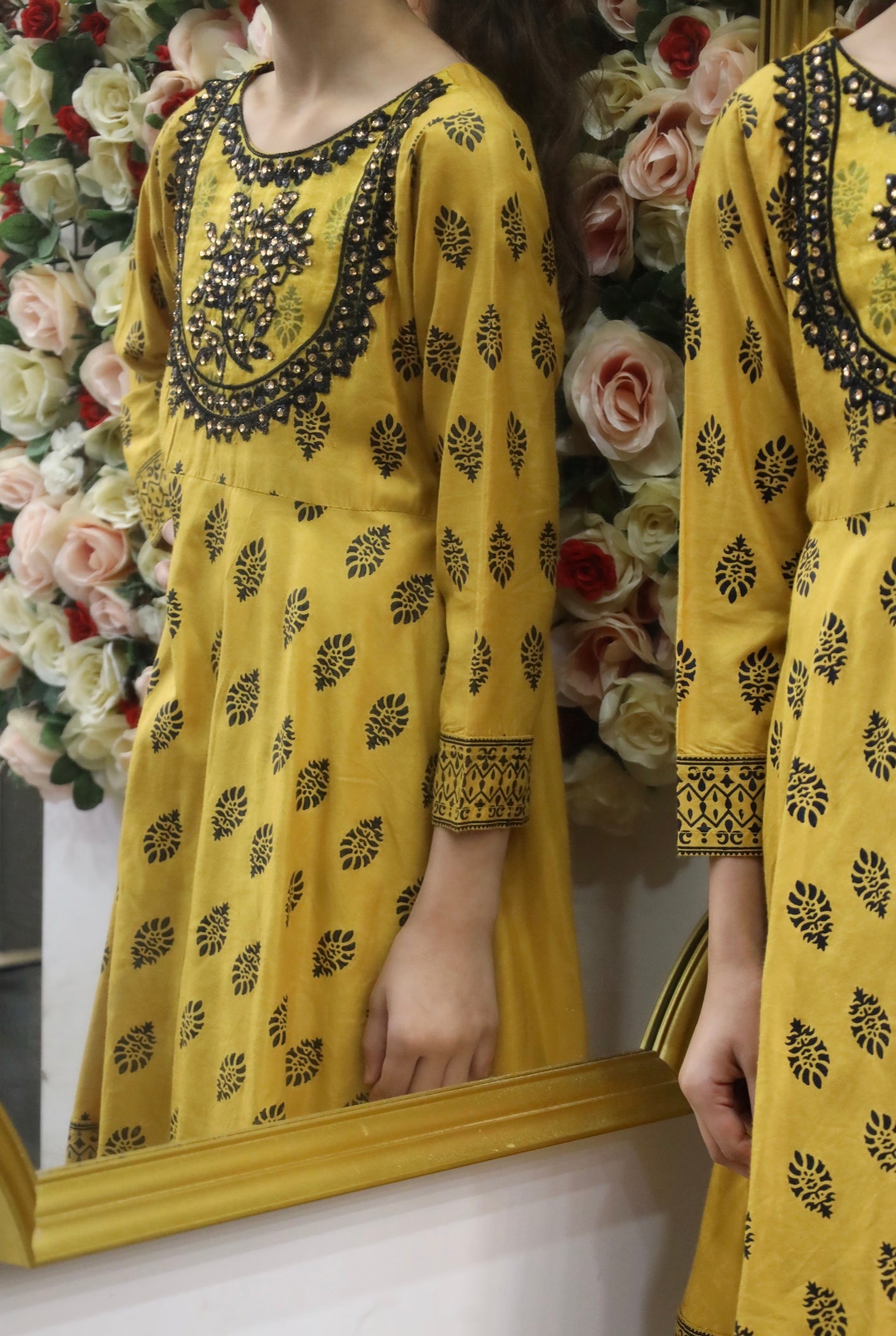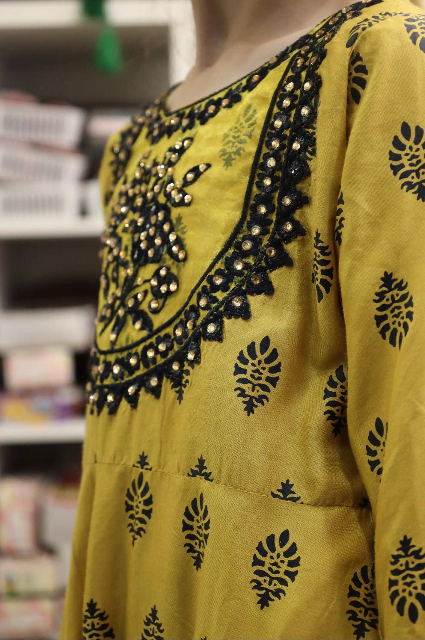 Design: A-line frock-style kurti with fitted sleeves and intricate mirror work embroidery on the neckline