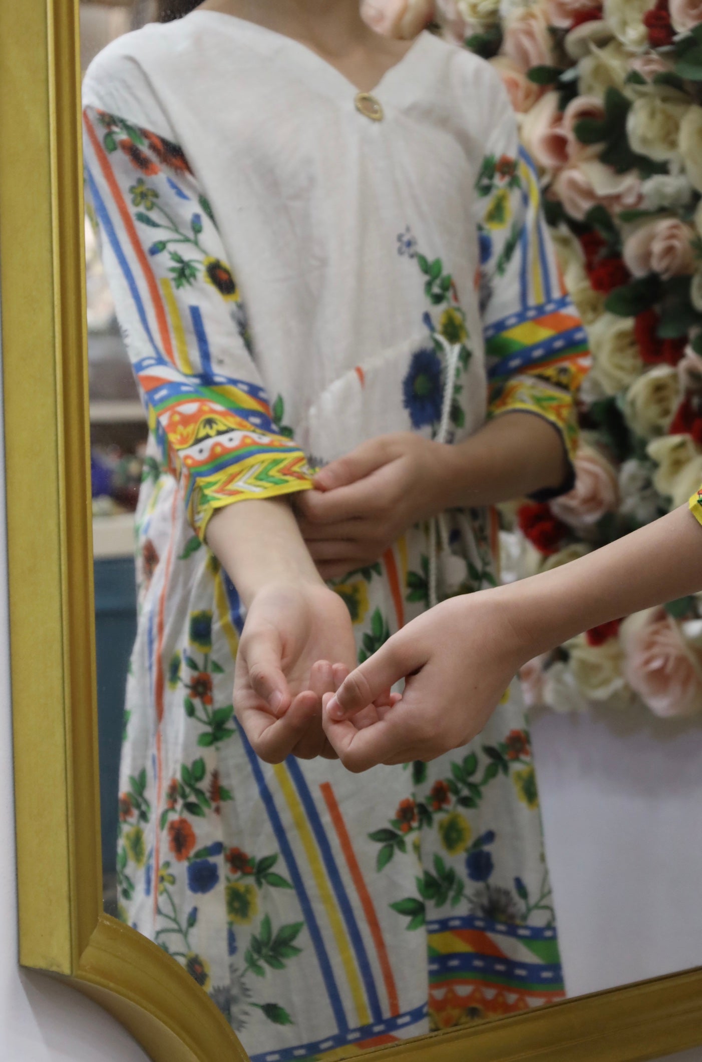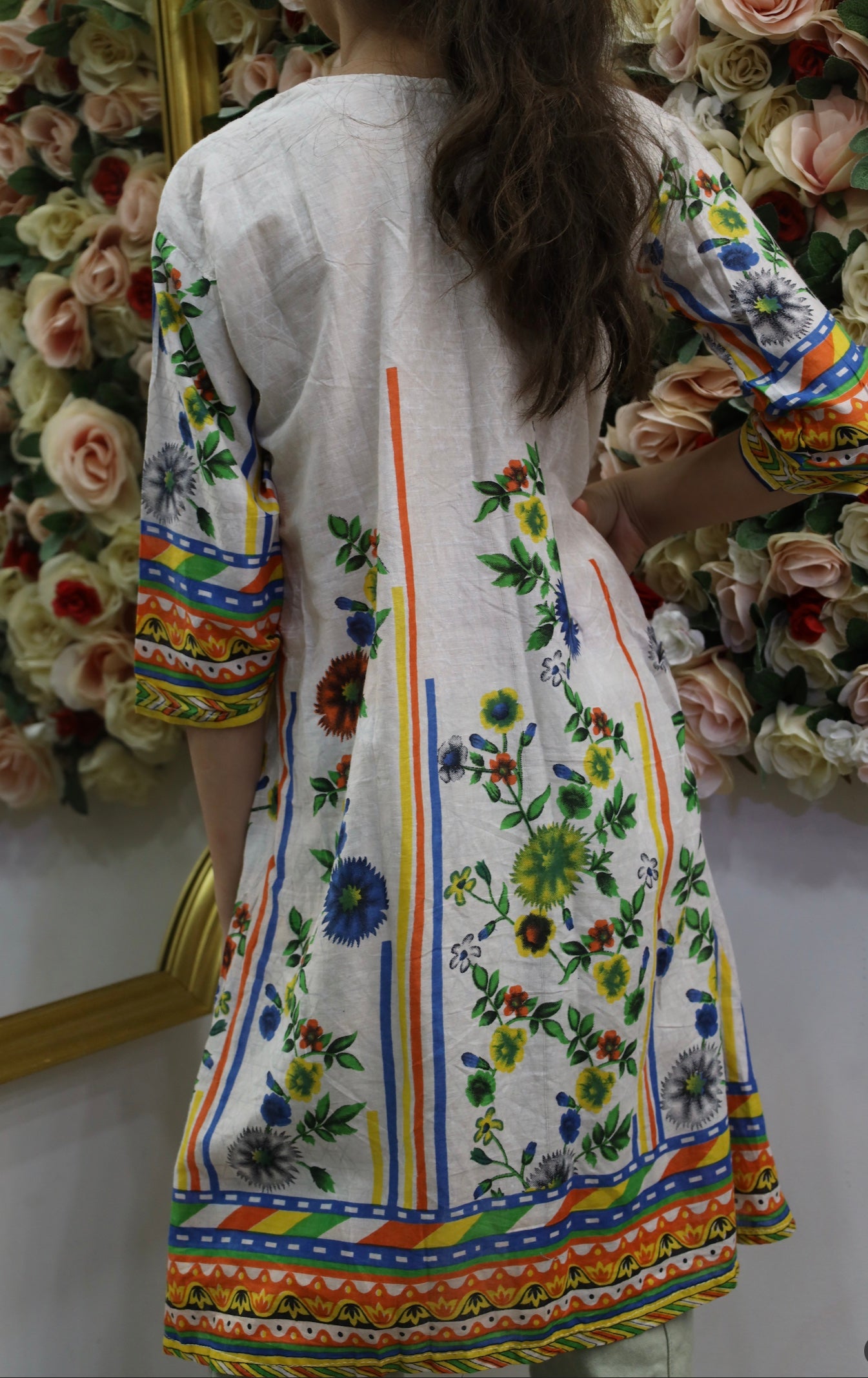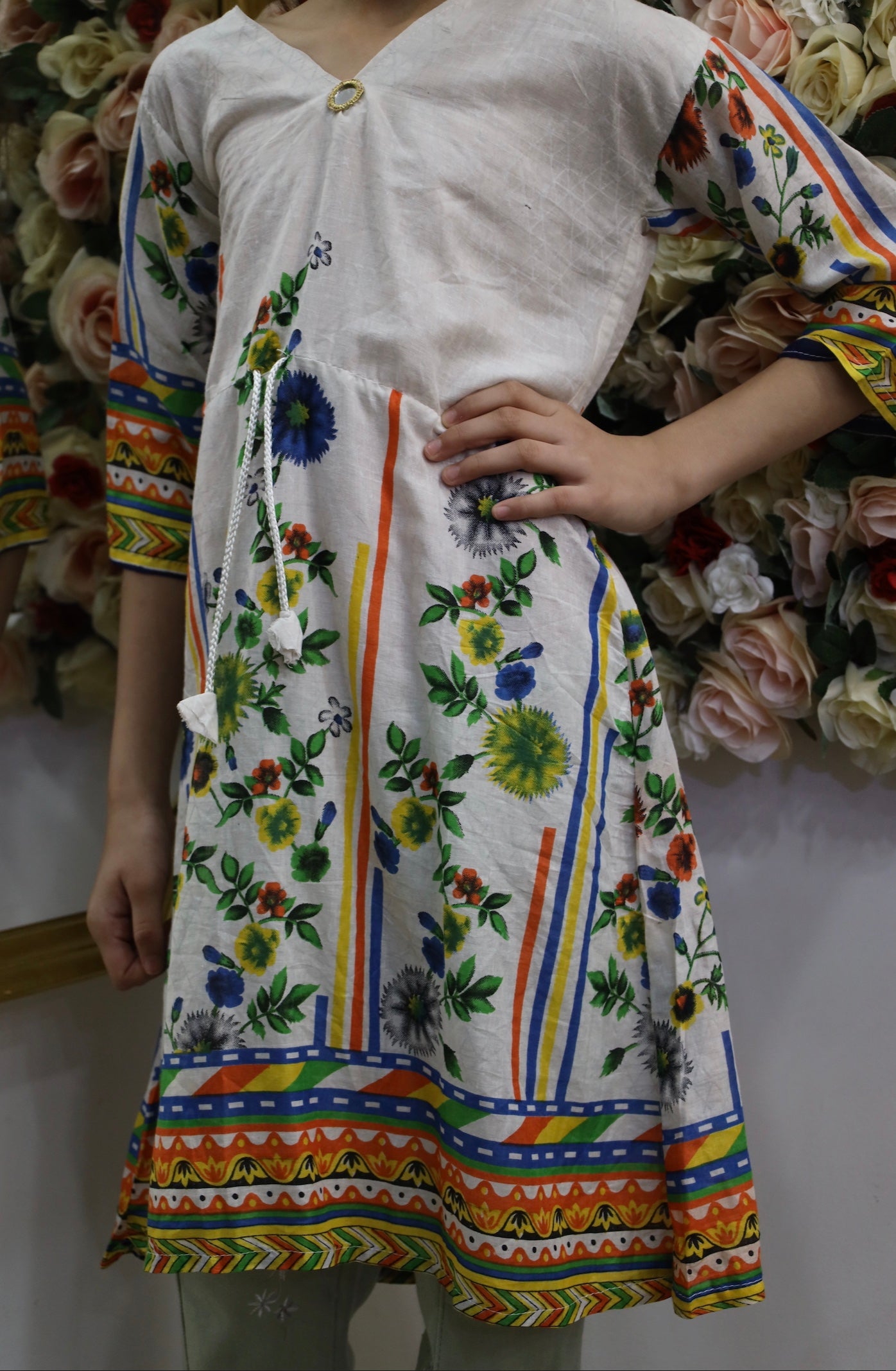 Bright, breezy, and bursting with color – this 2-piece lawn frock is a must-have for your little girl’s summer wardrobe. Featuring a fresh white base with multicolor floral and stripe patterns, this frock delivers the perfect mix of comfort and style.
